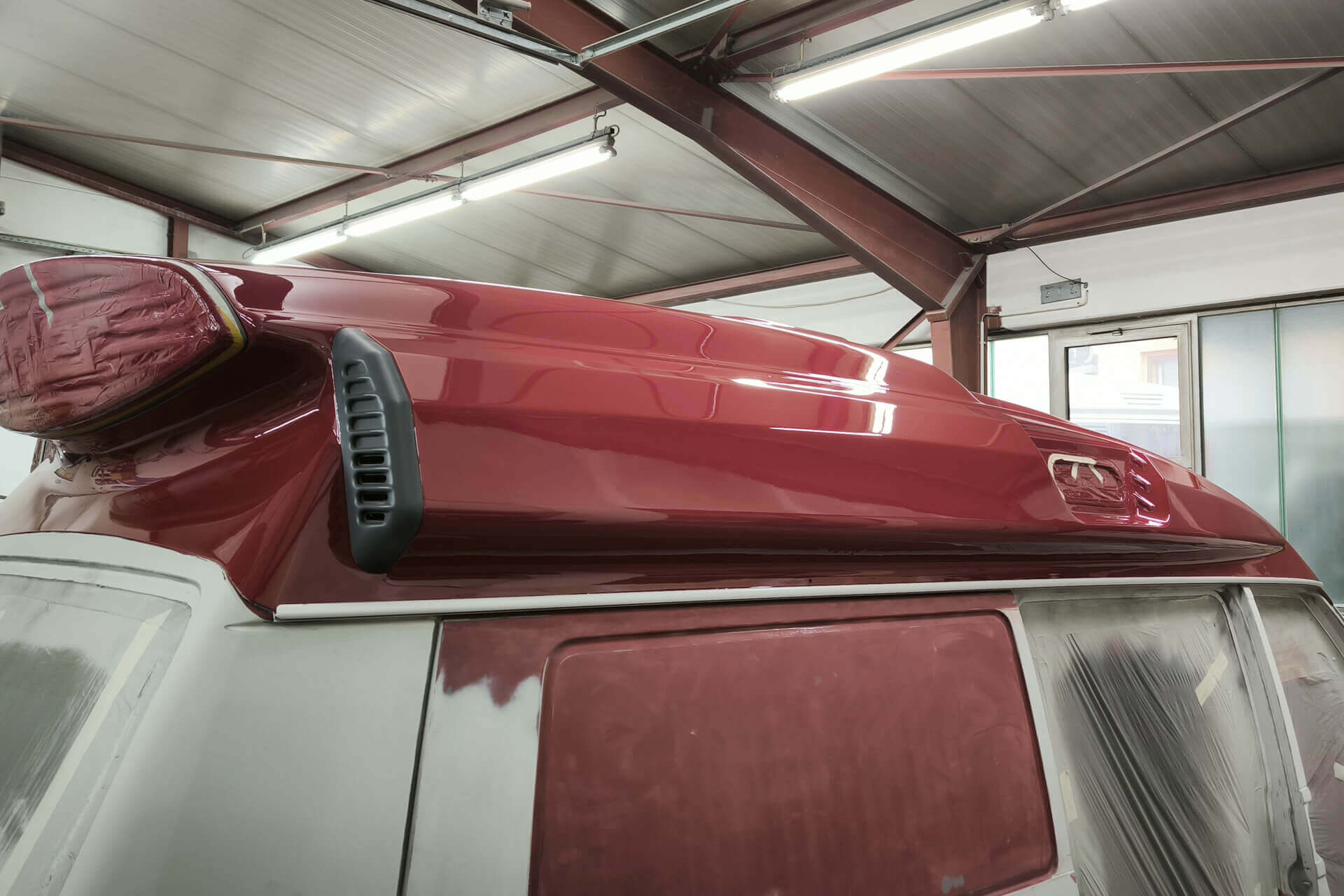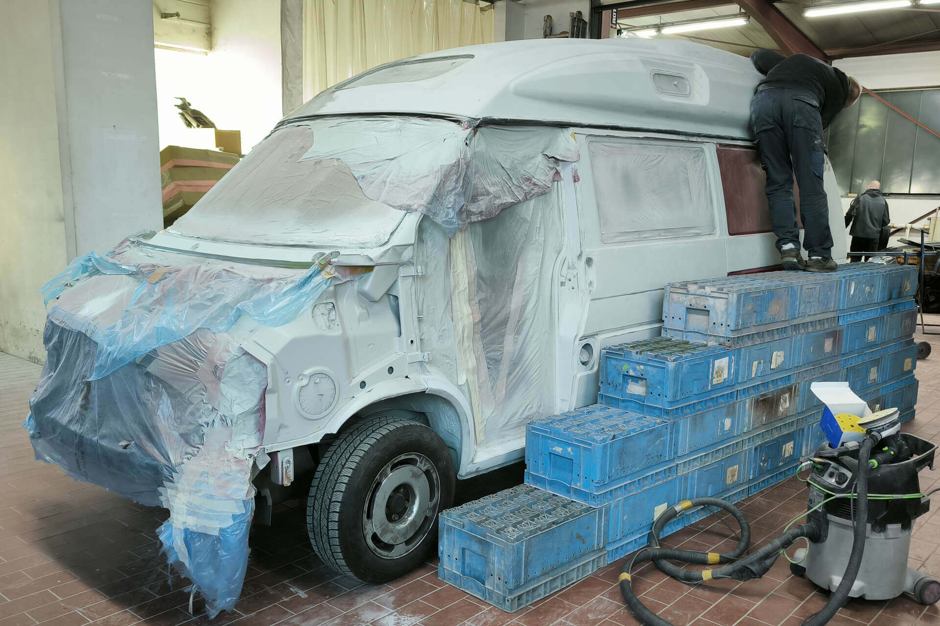 Nach den entsprechend aufwendigen Vorarbeiten ging der Dehler Optima in unsere Lackiererei.